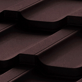 Металлочерепица в толщине 0,4 мм с матовым покрытием выпускается в цвете 8017 (шоколадно-коричневый)